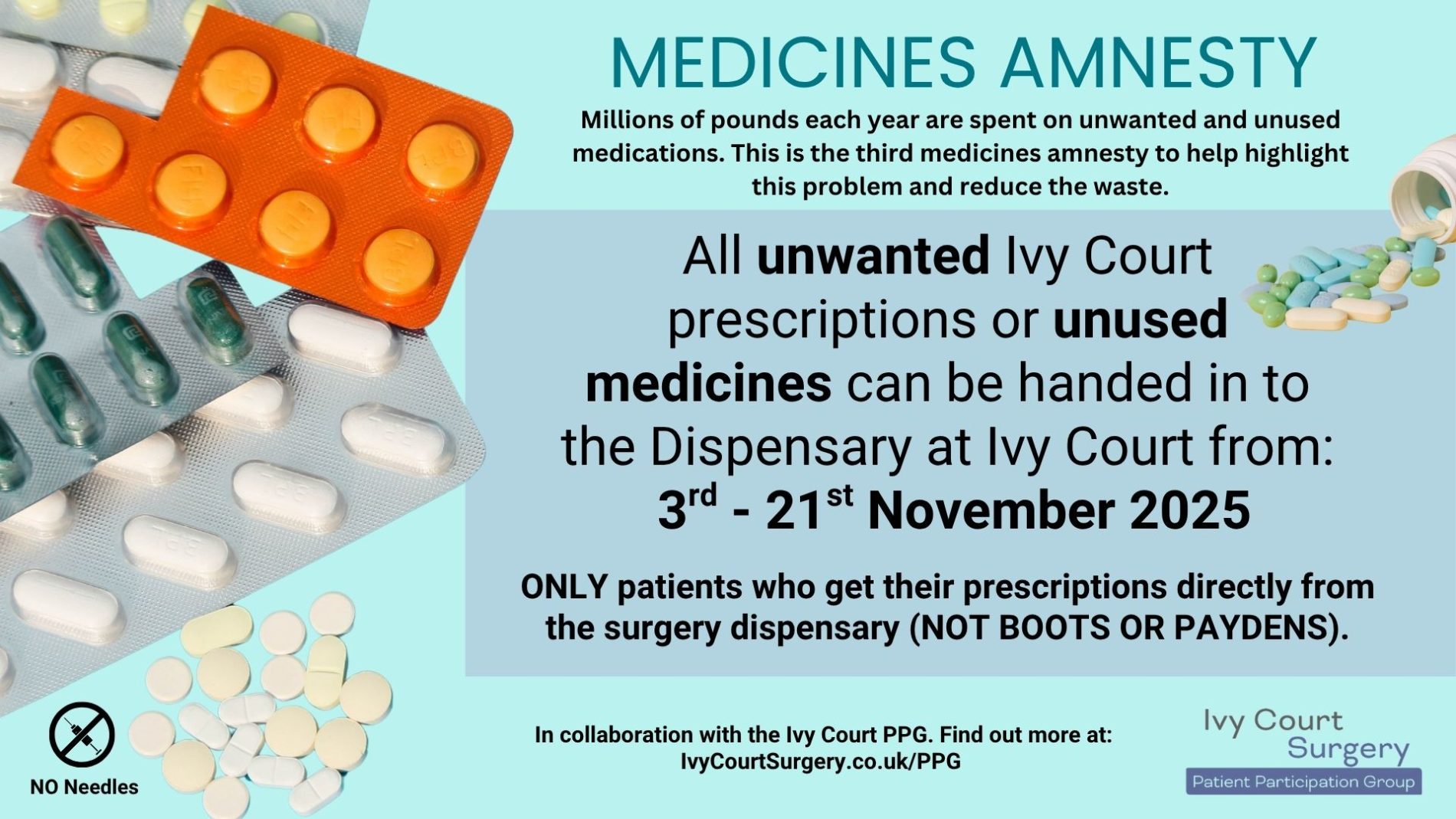 All unwanted Ivy Court prescriptions or unused medicines can be handed in to the Dispensary at Ivy Court from: 3rd – 21st November 2025
